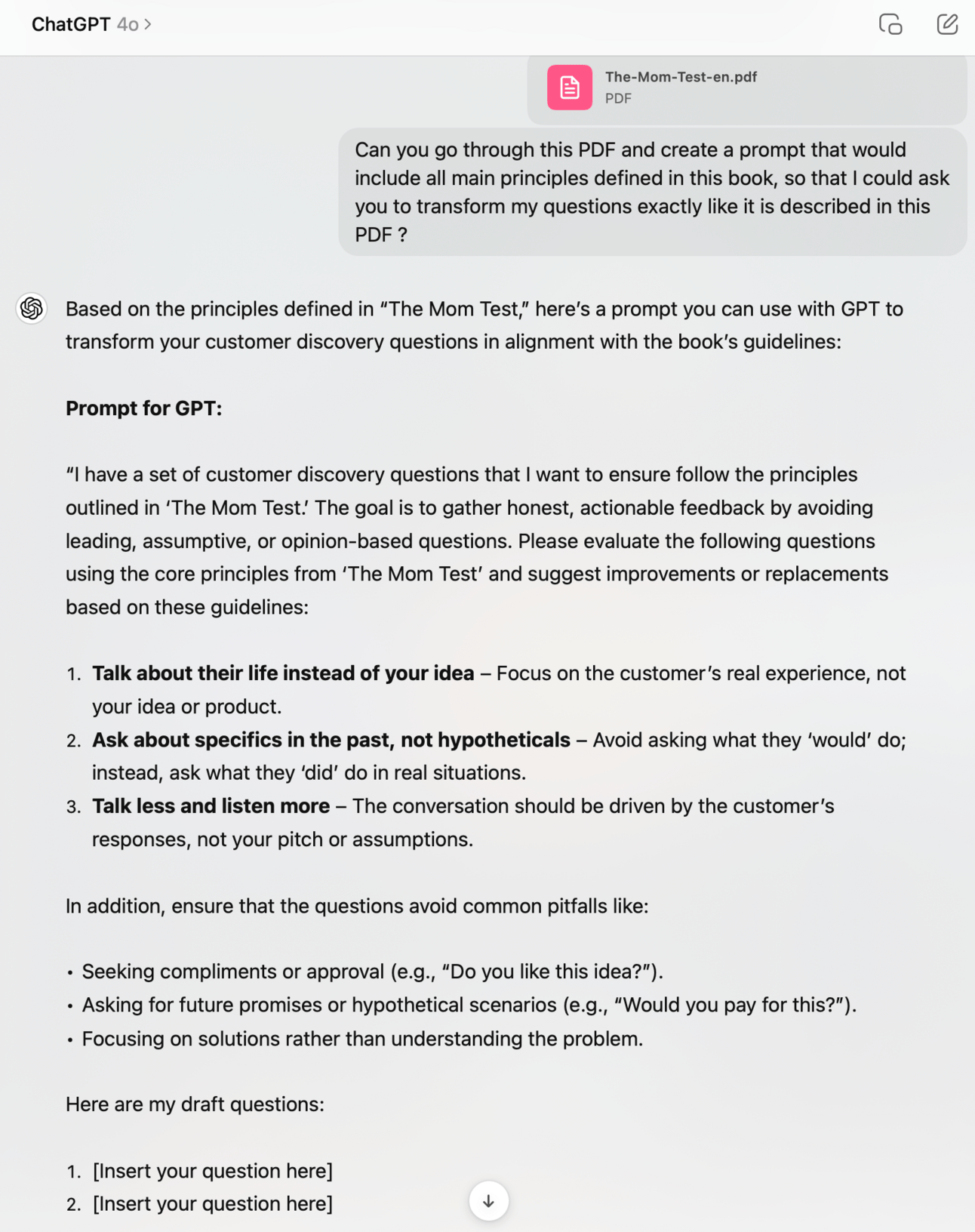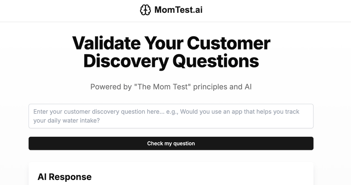I started using the book The Mom Test to create my questions, but constantly tweaking and validating them through GPT became cumbersome. That’s when I decided to build a tool - momtest.ai - to make this process easier for me and maybe help someone else.