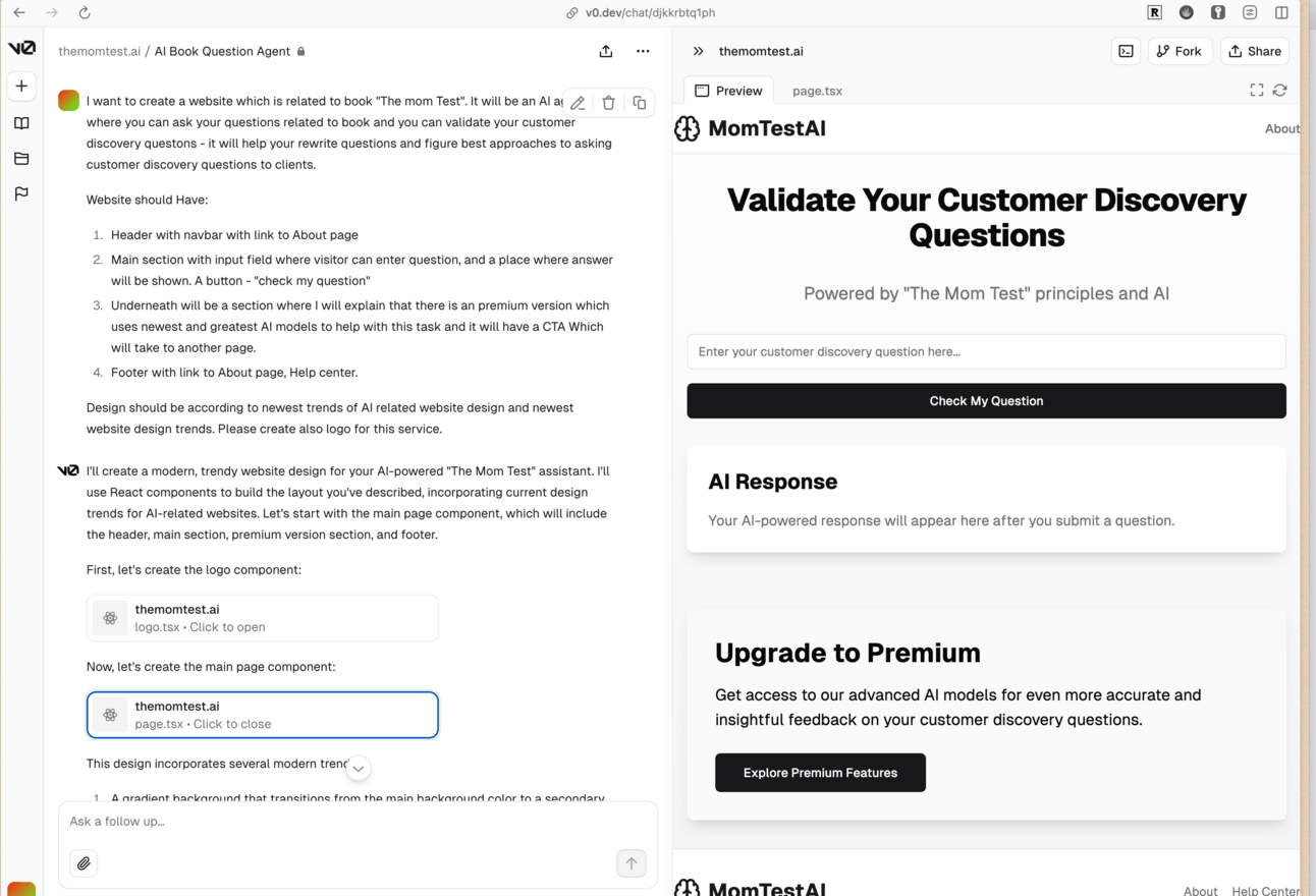 I recently built a web app, momtest.ai, to help me with customer discovery using principles from “The Mom Test.” In 49 minutes, with no coding or design, I used AI tools to build, design, and deploy the app. This experience showed how far AI tools have come, making it possible for anyone to create a solution with just conversations and minimal technical knowledge. The takeaway? Test new AI tools, solve your own pain points, and potentially build something valuable—without needing a developer or designer.