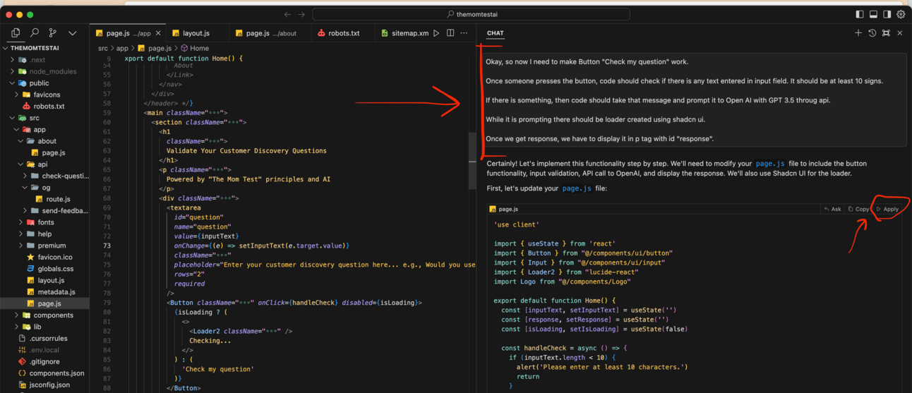 With the help of the AI assistant in this code editor, I effortlessly made the button work and connected it to OpenAI. All it took was pressing “Apply” to all the code changes it suggested, including some additional steps like inputting the OpenAI key.